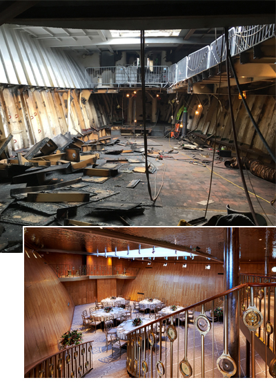 The conversion also included a spectacular round glass lift for the guests, and a separate back of house lift and stairwell for staff which connected the main galley to the four decks above, meaning they could access all areas from ‘behind the scenes’.