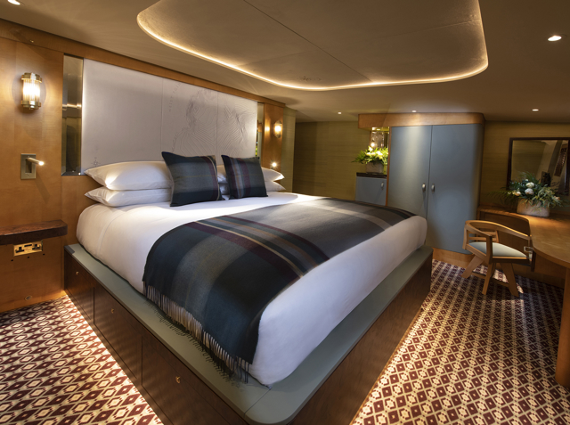 For an unforgettable experience. Gaze out across the water and watch the twinkling city lights before curling up in the spectacular luxury of your cabin. Sumptuous heritage fabrics created by Scottish textile designer Araminta Campbell tell the Fingal Hotel's story. The purple heather of the Scottish mountain landscape, a bright light casting the warm glow of the lighthouse beam, guarding ships safely away from the rocky shores.